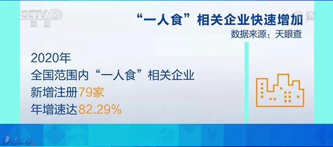單身人數(shù)規(guī)模的增大,進一步催生了“單身經(jīng)濟”“一人食”經(jīng)濟。根據(jù)天眼查,我國目前有184家企業(yè)名稱、經(jīng)營范圍、產(chǎn)品服務(wù)或商標中包含“一人食”。2020年,全國范圍內(nèi)“一人食”相關(guān)企業(yè)新增注冊79家,年增速達82.29%。