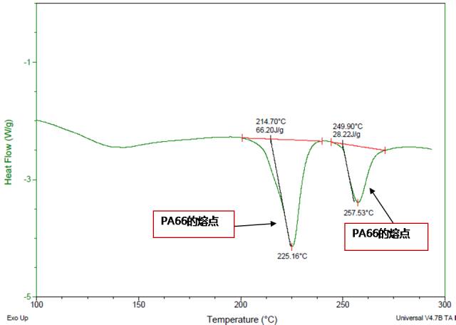 通過熔點(diǎn)也是快速鑒定尼龍的一種方法,不同的尼龍熔點(diǎn)也有差異,這也反映了不同尼龍耐溫性方面的差異。以圖2樣品C的DSC結(jié)果為例,結(jié)合樣品C的紅外就可以判斷樣品中含有PA6和PA66。