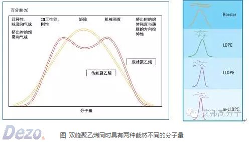 雙峰聚乙烯是指分子量分布曲線呈現(xiàn)兩個峰值的聚乙烯樹脂,與普通聚乙烯相比雙峰聚乙烯同時具備優(yōu)良的物理機械強度和優(yōu)異的加工性能——其中高分子量部分用以保證其物理機械強度,低分子量部分在樹脂中起到潤滑作用,用以改善產(chǎn)品加工性。