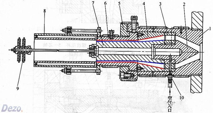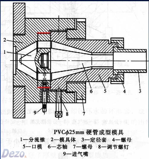 現(xiàn)以管材擠出機頭為例,分析一下機頭的組成與結(jié)構(gòu),見圖所示。