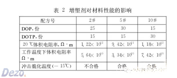 由表2可知:10#配方在20及工作溫度下體積電阻率比5#配方高,這是因?yàn)殡m然兩個(gè)配方的增塑劑總用量相同,但10#配方中DOTP的比例較5#配方多所致;2#配方20及工作溫度下體積電阻率比5#配方高,這是因?yàn)樵贒OTP加入量相同下,2#配方中DOP加入量較5#配方少,絕緣電阻隨著增塑劑加入量增多而下降所致。另外,從表2也可以看出,2#配方的低溫沖擊實(shí)驗(yàn)不合格,這是因?yàn)?#配方的增塑劑用量較少導(dǎo)致材料的玻璃化溫度升高。因此絕緣電阻與低溫沖擊性能是一對矛盾,要使他們同時(shí)滿足標(biāo)準(zhǔn)要求,必須選擇適合的增塑劑并將其添加量控制在合適的范圍。