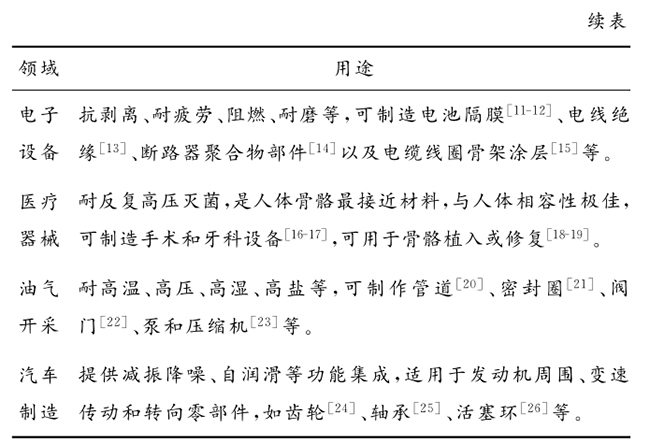PEEK特種工程塑料因具有優(yōu)良的綜合性能使其在不同領(lǐng)域中發(fā)揮著巨大的作用。PEEK在各領(lǐng)域的應(yīng)用如下表2所示。