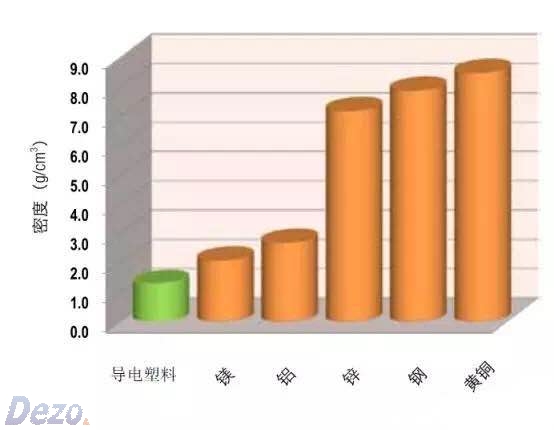 導(dǎo)電塑料產(chǎn)品最重時不足常用金屬零件的四分之一。其密度為1.2至1.4g/cm3,是鋁密度(2.7g/cm3)的一半,并且遠小于其它常用金屬的密度。重量輕,加上能夠成型的壁厚薄至1.0mm或為鋁壓鑄件的一半,從而使得零件的重量減輕75%。雖然由于密度大幅降低,但它壁厚必須大于沖彎不銹鋼金屬零件,但其重量可以比不銹鋼零件輕50%。對于手持設(shè)備應(yīng)用等,可以幫助減輕重量和節(jié)省成本。