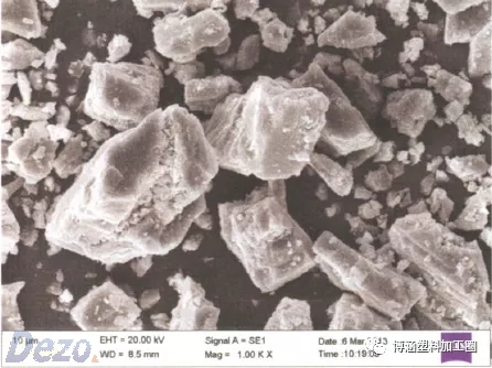 用高倍顯微鏡看,重鈣產品由于采用機械粉碎和分級,顆粒形態(tài)一般多為立方體、多棱體、長方體等不規(guī)則形態(tài),具體見圖1所示。對于不同的重鈣加工方法,碳酸鈣的微觀形狀不同,例如用擂蒙磨加工的碳酸鈣為紡錘形,用氣流磨加工的碳酸鈣為顆粒形。