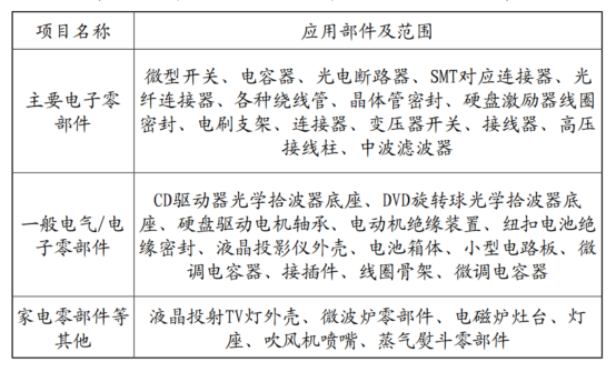 表3 PPS在電氣/電子零部件上的應(yīng)用明細(xì)表