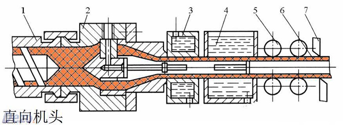 可分為直向機頭和橫向機頭,前者機頭內(nèi)料流方向一與擠出機螺桿軸向一致,如硬管機頭;后者機頭內(nèi)料流方向與擠出螺桿軸向成某一角度,如電纜機頭。
