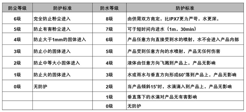 固體防護(hù)等級(jí)有 7 個(gè)等級(jí),用 0-6 表示;液體防護(hù)等級(jí)有 9 個(gè)等級(jí),用 0-8 分別表示。如 IP68 是指固體防護(hù)等級(jí) 6 級(jí),防水等級(jí) 8 級(jí)。具體可以參照下表。