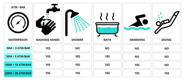 此外智能手表常用的還有國(guó)際標(biāo)準(zhǔn)化組織(ISO)定義的防水標(biāo)準(zhǔn) ISO 22810:2010。ATM(Atmosphere)代表大氣壓,等于10米水深的壓力。5 ATM 表示在常溫環(huán)境下模擬可承受50米靜止水深的壓力且持續(xù) 10 分鐘,并非是實(shí)際 50 米水下的防水能力。